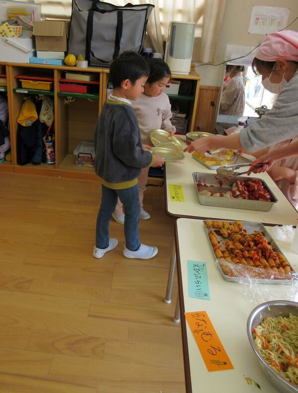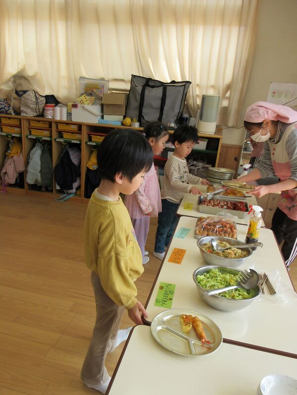 今日の給食はバイキング(*^▽^*) 3歳以上児さん、バイキング形式の給食に朝からウキウキ♬ 主菜とサラダを選んだよ(*^-^*) ハンバーグとエビフライと玉子焼きの中から2種類、サラダも2つからどちらか好きなものを選びました 「おかわりもしてたくさん食べよう」嬉しそうな子ども達です(*^▽^*) 「いただきまーす!」美味しかったよ(^O^)/ 2026/02/20
