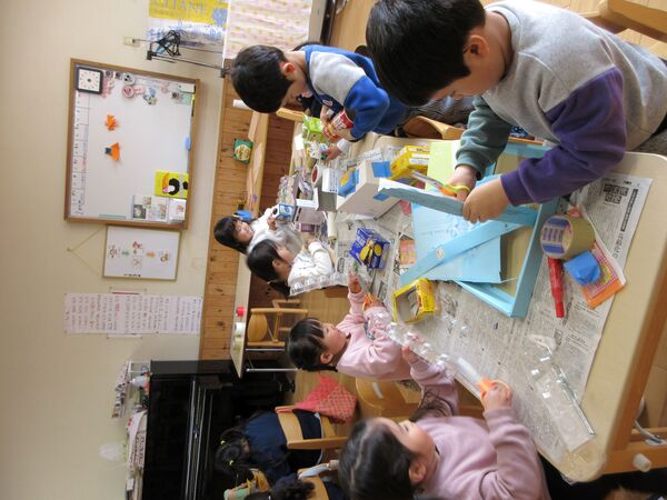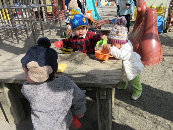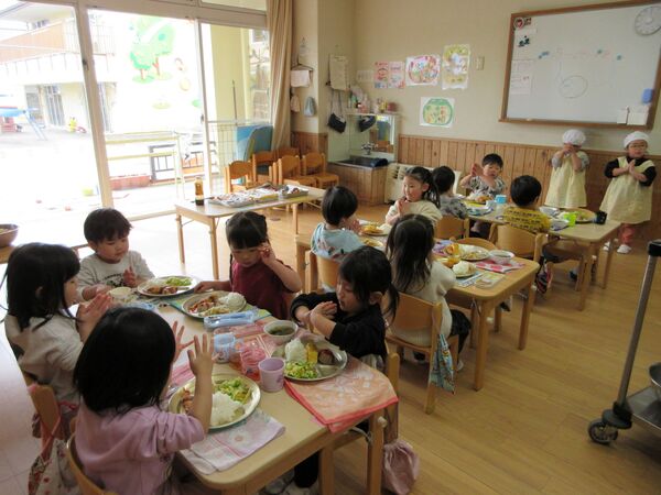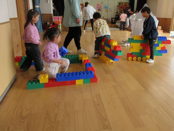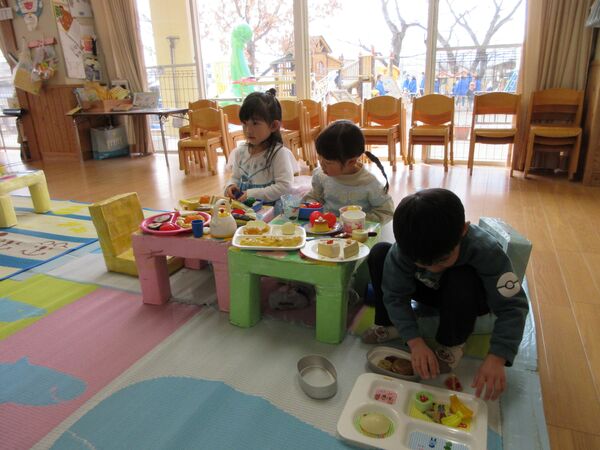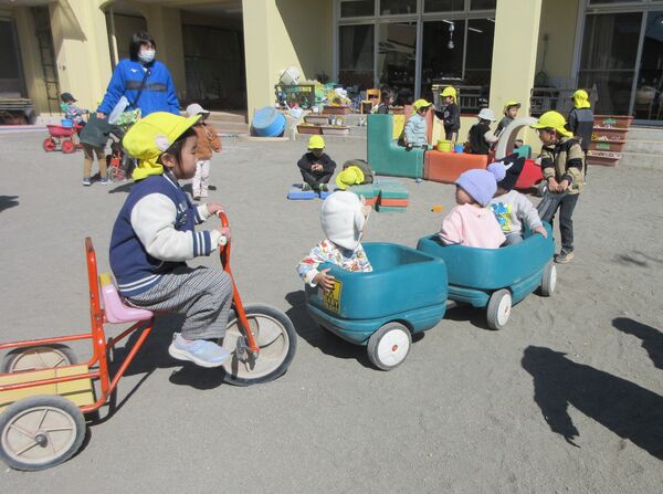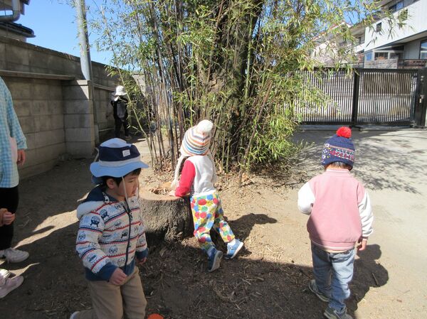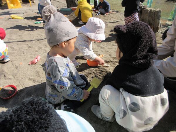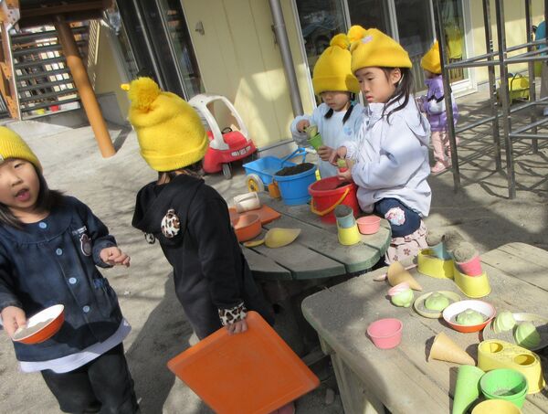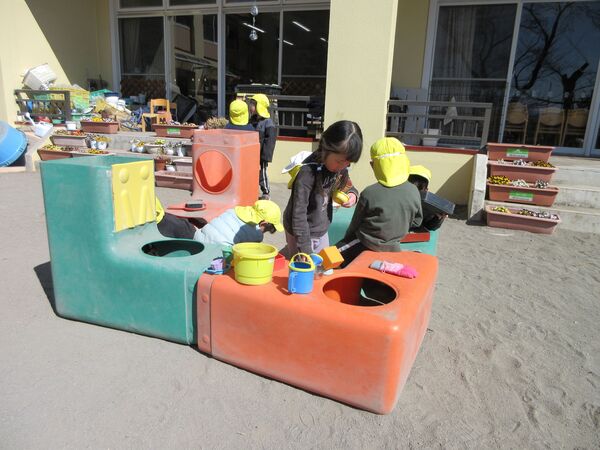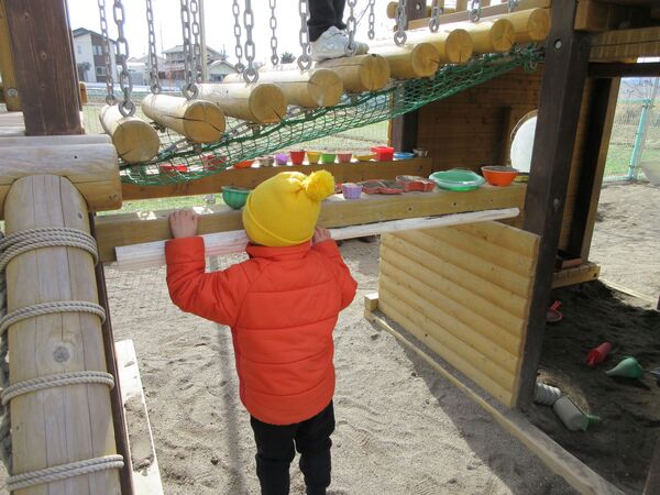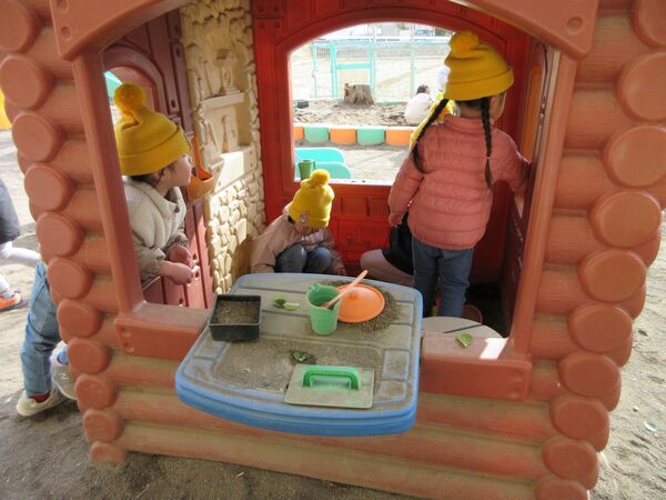 園庭にて 今日の園庭もぽかぽか陽気でした(*^-^*)狭い所を探検しています。 うさぎ組はかくれんぼしていました。みんなで同じ所に隠れていてかわいいです(*^_^*) 砂場では型抜きしてもらっては崩すのが楽しくて「やって〜」とお願い(*^▽^*) 年上のお友だちが引いたり押したりしてくれました(*^-^*) 大きいL字のブロックでお家を作ったよ(^^♪ 昨日は食べ物博士が登場して今年のまとめ、その日のメニューの食材をあかっち・きいぼう・みどりんに分けてみたよ!さくら組は正解がいっぱい! 2026/03/12