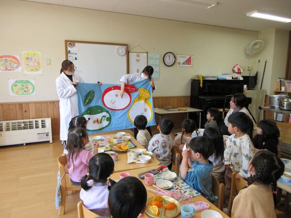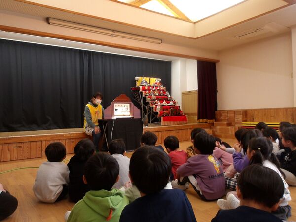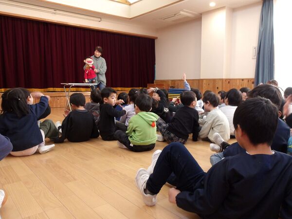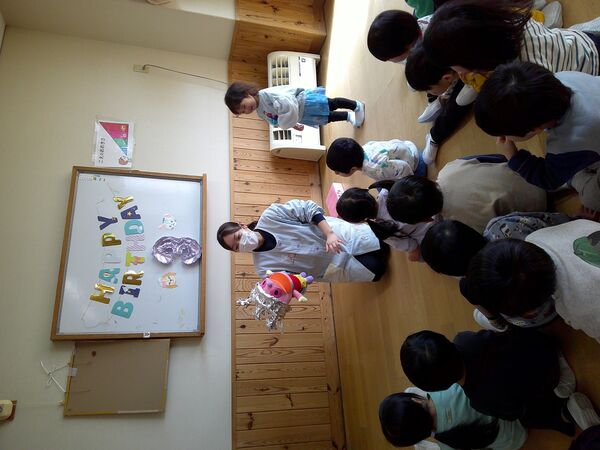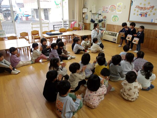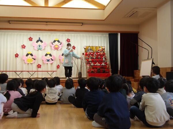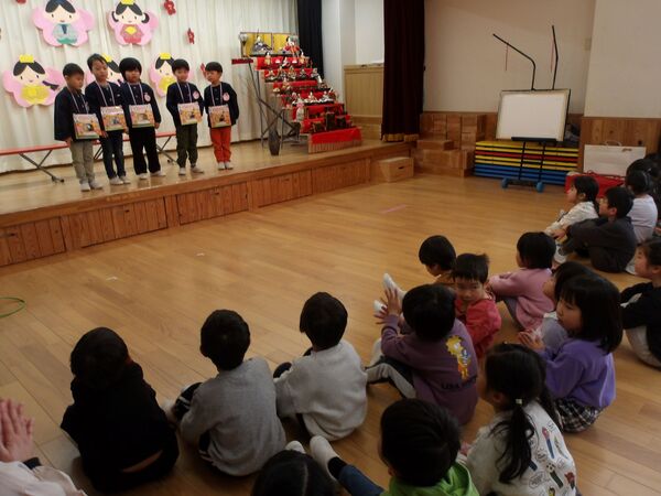 3月の誕生会がありました🎉 3月3日なので、ひな祭り誕生会となりました。たんぽぽ組も一緒に雛人形のお話しを聞いたよ(^^♪ すみれ組、さくら組の誕生会はホールでしました。「おめでとう!」とお祝いしてもらい入場。 ステージでインタビューに答えたよ♬楽しみにしていたけど、少し緊張したみたい(*^-^*) 読み聞かせに来てくださった方々の絵本や紙芝居やブラックシアター、楽しかったね♬ たんぽぽ組はお部屋でお祝い、インタビューでは好きな動物や食べ物を聞いてみたよ(^^♪ パネルシアターを見たり、リズムあそびをして盛り上がりました(^O^)/ 2026/03/03