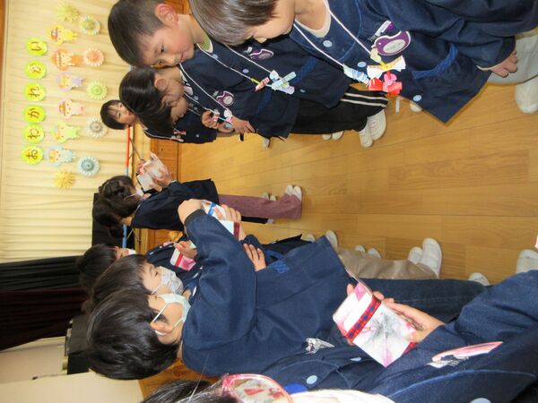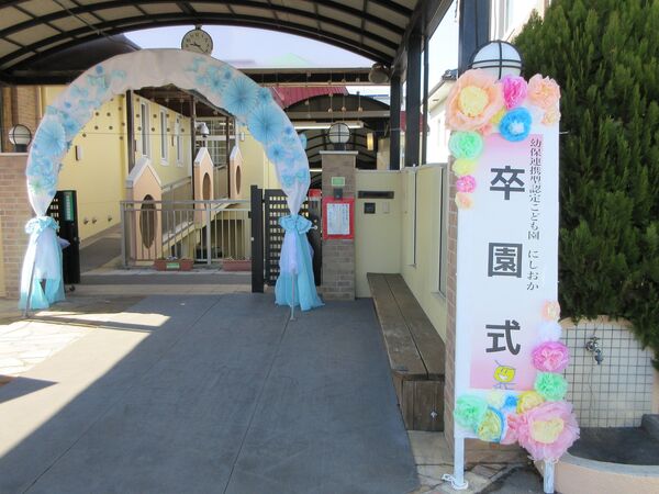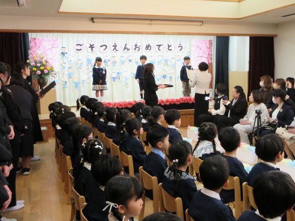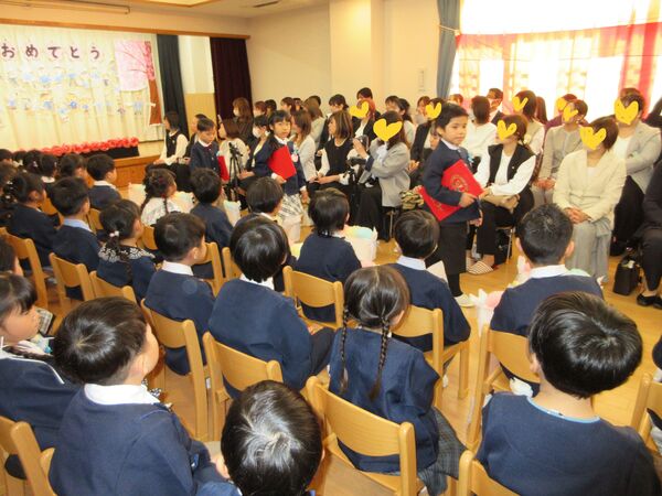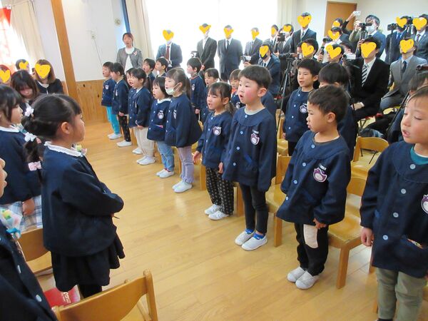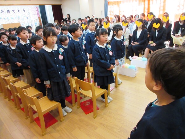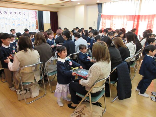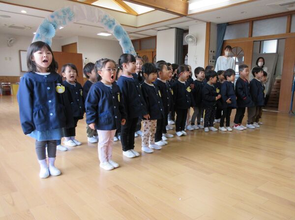 令和7年度の卒園式を行いました💐 園の入口にアーチを飾ってお祝い🌸 ステージに上がって卒園証書授与。ステージの絵はさくら組が自分自身の絵を描きました。 卒園証書を頂いた顔は、また一段と凛々しく見えます。 在園児を代表してすみれ組が出席しました。呼びかけも上手に出来ました(*^-^*) さくら組は呼びかけや歌もとっても素敵でした(*^-^*)小学校へ行っても応援してるからね(^O^)/ 最後は卒園児からお家の方にプレゼントを渡しました!夏に育てた繭で作りました(*^▽^*)ぎゅうーてしてもらったよ! 2026/03/16