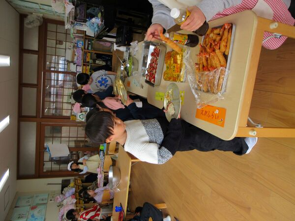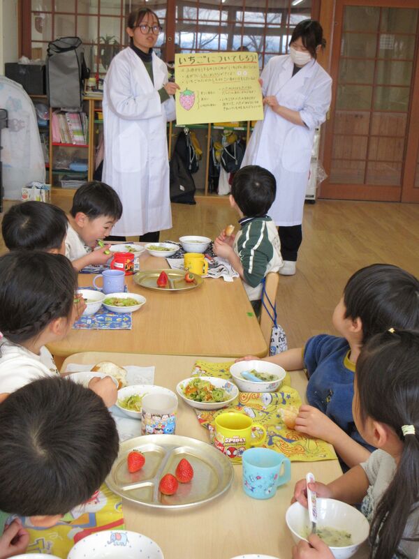 わくわくウィークの様子と食べ物博士 今週はわくわくウィークで3歳以上児は自分の好きな場所へ行って遊びました。こちらは廃材コーナー 廃材を切ったり張ったり、好きな形になるように頑張っています(*^-^*) こちらはおままごとコーナー、ドレスを着てお人形のお世話に忙しそうです(*^▽^*) 美味しそうなお料理をたくさん並べましたね(^^♪ ホールでは大きいブロックでお家や車を作ったよ(*^▽^*) 食べ物博士は「いちご」について教えてくれたよ🍓今が一番美味しい季節なんだって♬給食にもいちごがでました 2026/02/17